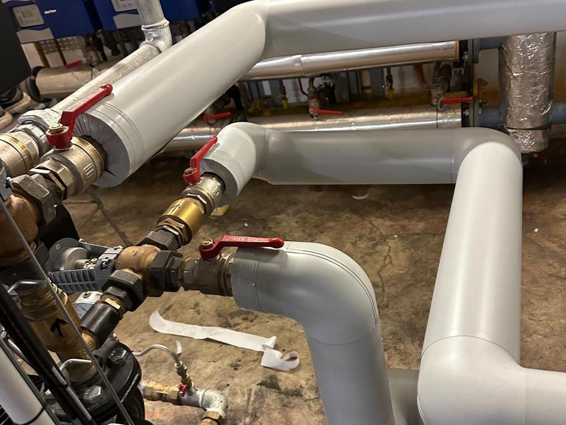Le calorifugeage mis en œuvre dans cette chaufferie collective, recouvre les conduites principales ainsi que les éléments de distribution afin de maintenir la température du fluide caloporteur tout au long du réseau.