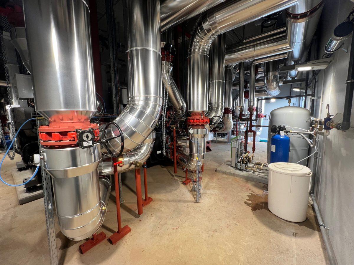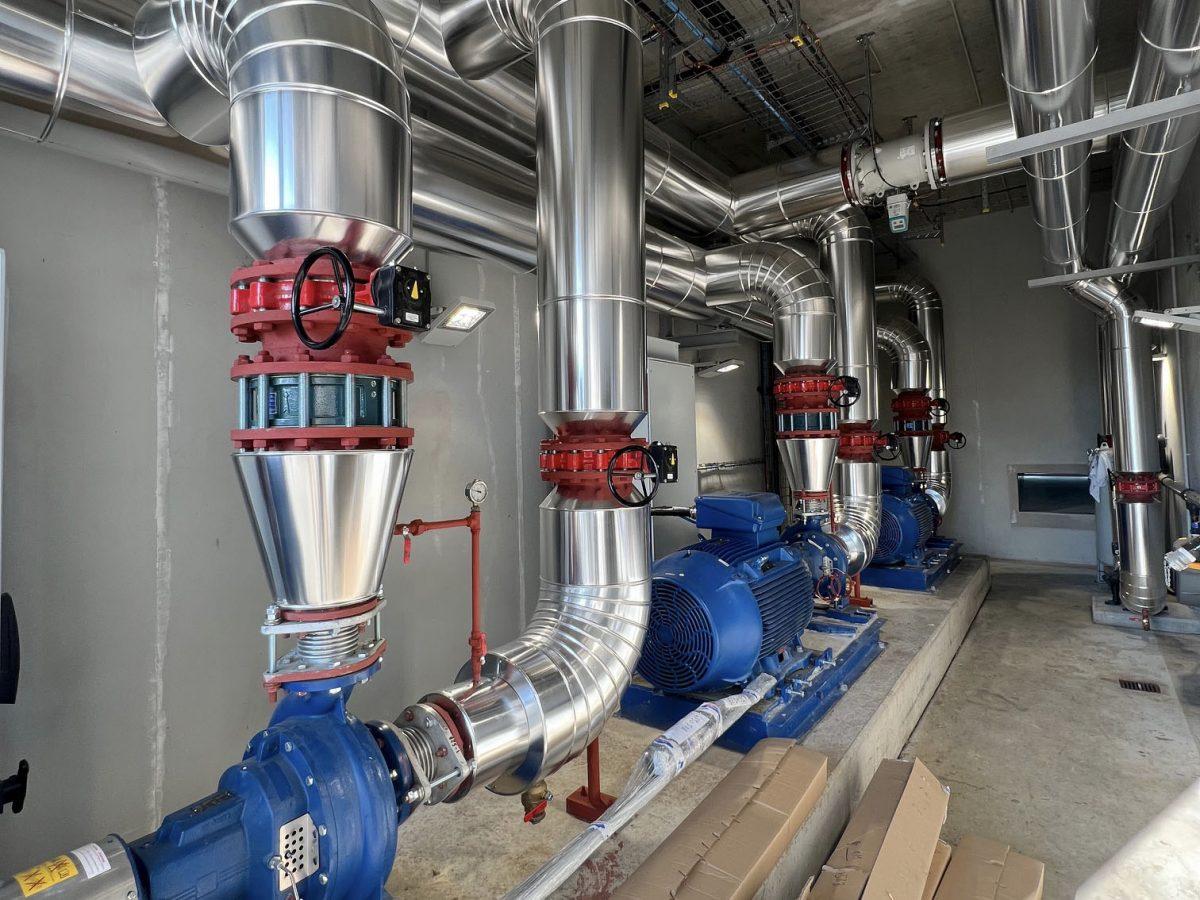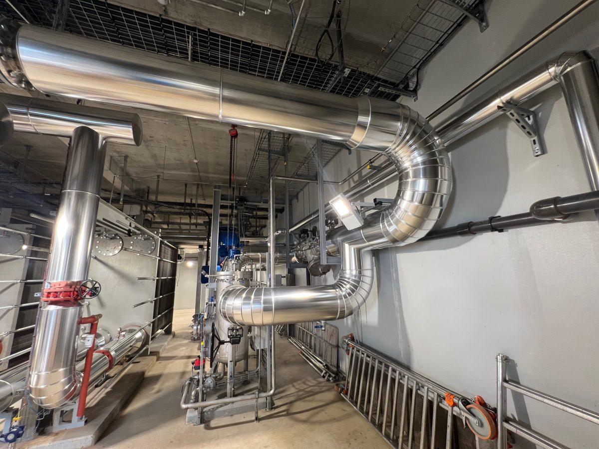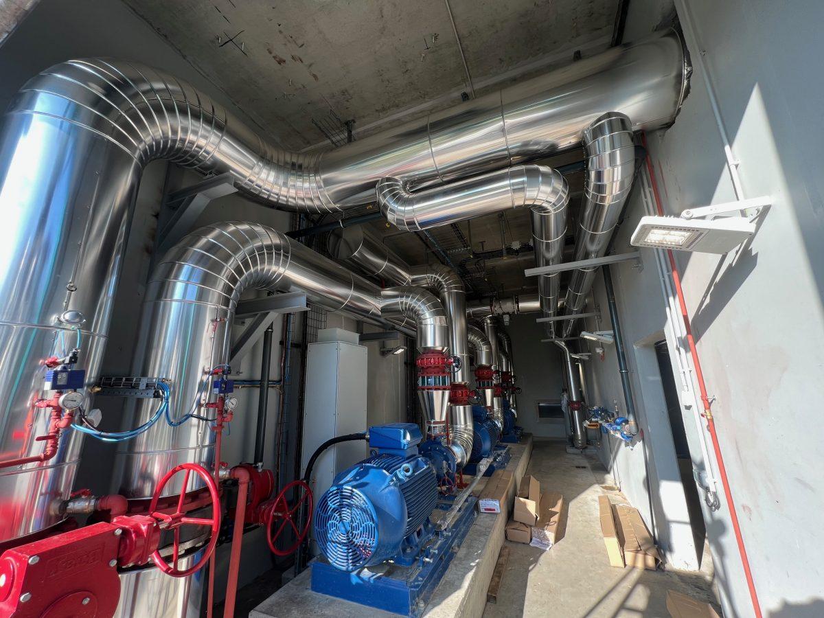 La chaufferie repose sur un système de captage de l’eau du Dogger à près de 60 °C, exploité grâce à des forages en profondeur. L’eau est ensuite acheminée via un réseau de canalisations inox, isolées et protégées, avant d’être réinjectée dans la nappe après usage. Collecteurs, vannes et conduits ont été installés avec la plus grande rigueur afin d’assurer performance, durabilité et sécurité de l’installation. Le savoir-faire d’ERCE garantit la fiabilité d’un dispositif appelé à fonctionner de manière continue pendant plusieurs décennies.