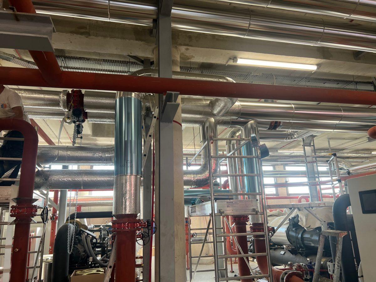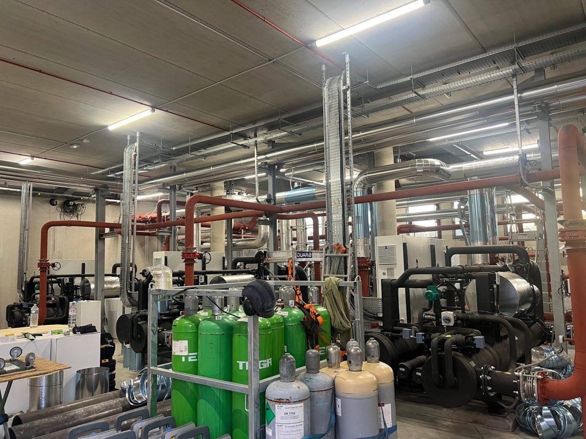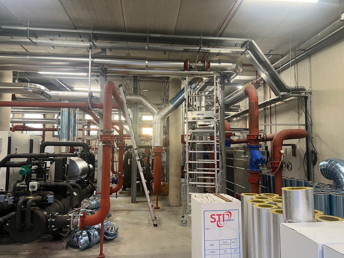 L’ensemble des réseaux a été calorifugé avec de la laine de roche revêtue kraft alu, un isolant thermique reconnu pour ses hautes performances et sa résistance au feu. Ce matériau offre également une bonne tenue dans le temps, même en environnement humide. Pour parfaire la finition et assurer une protection mécanique robuste, les gaines ont été recouvertes de tôle Isoxal, une tôle en aluminium laquée, légère, anticorrosion et esthétique. Le résultat est à la fois fiable et visuellement soigné.