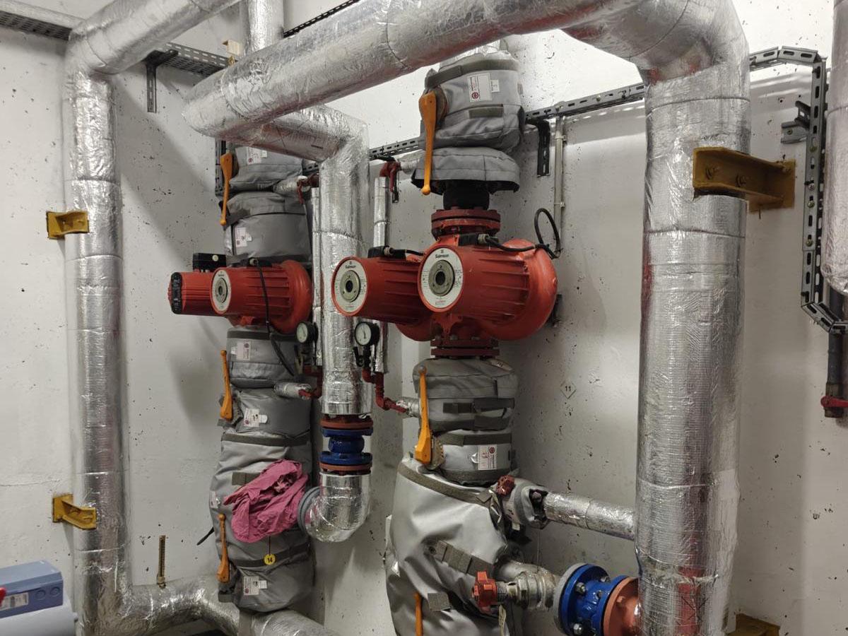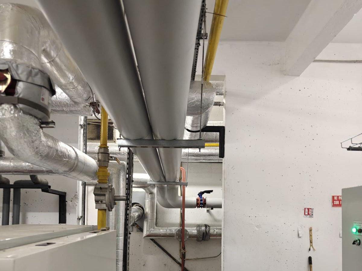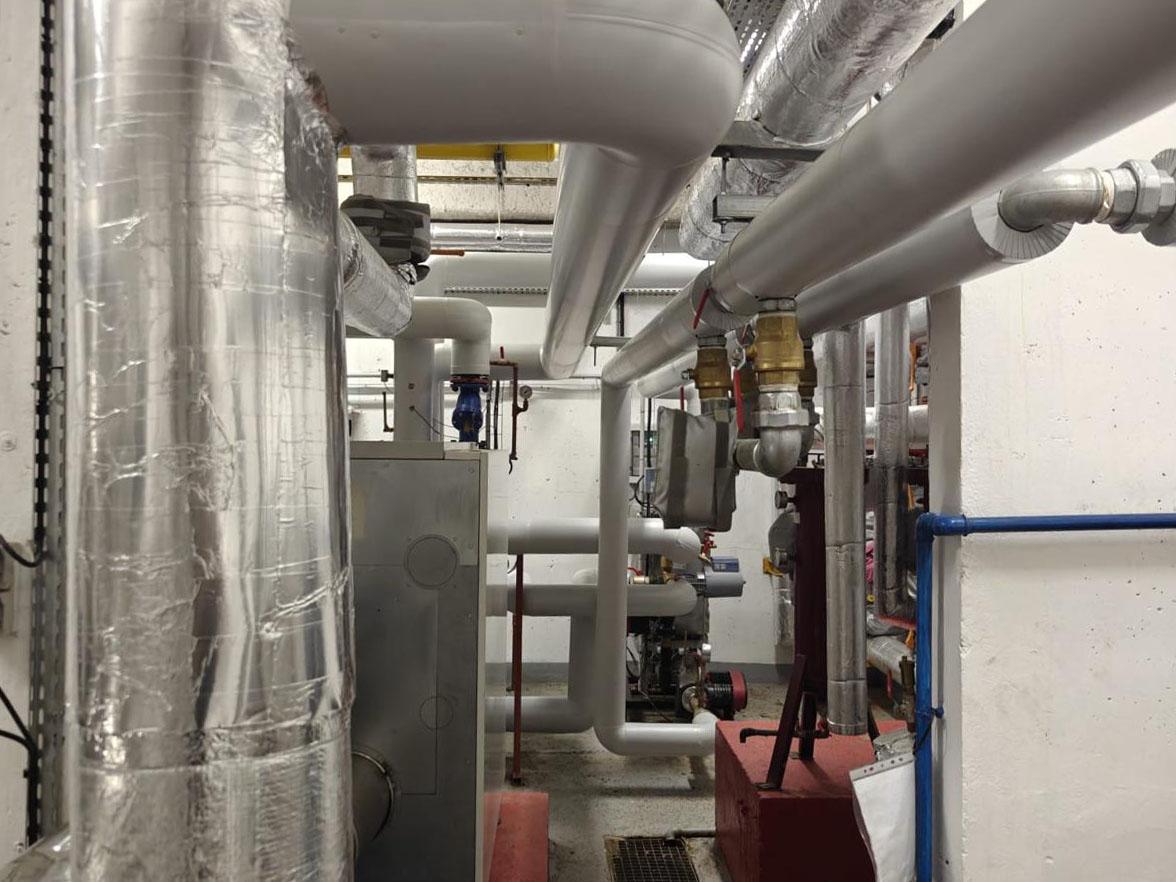 L’installation repose sur un ensemble de collecteurs et de réseaux calorifugés permettant la distribution de chaleur vers les différents circuits du bâtiment. Les canalisations principales ont été reprises et isolées afin de limiter les pertes thermiques et d’améliorer le rendement global de l’installation.