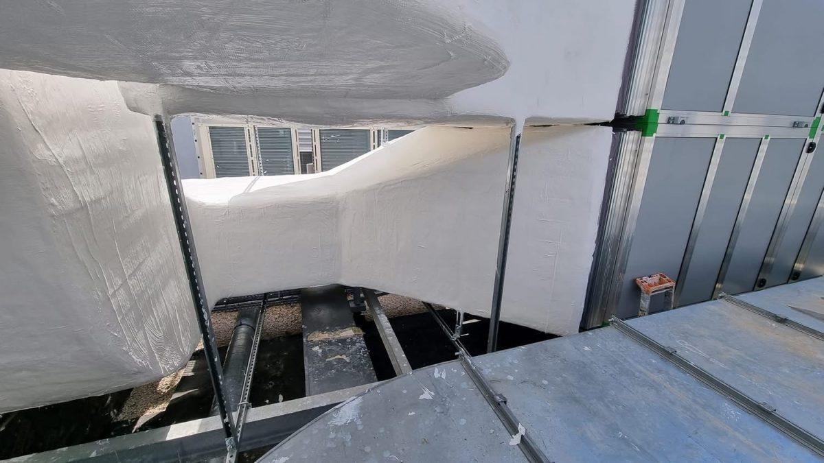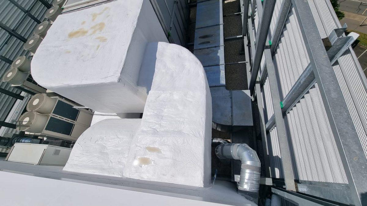 Pour protéger l’isolation de la gaine de ventilation, les équipes ERCE ont posé une toile de verre, ensuite recouverte d’un revêtement Flogul blanc. Cette finition garantit à la fois une étanchéité parfaite, une résistance mécanique élevée, et un rendu visuel propre et homogène, y compris sur une surface technique extérieure.
