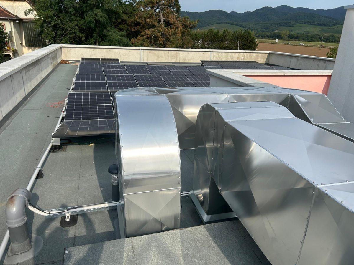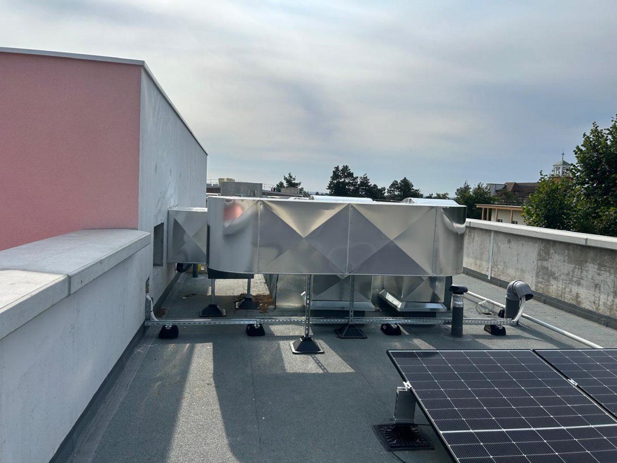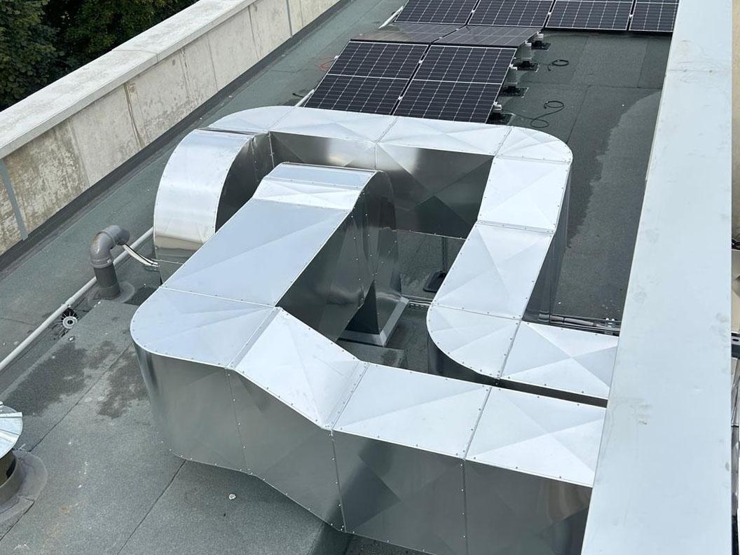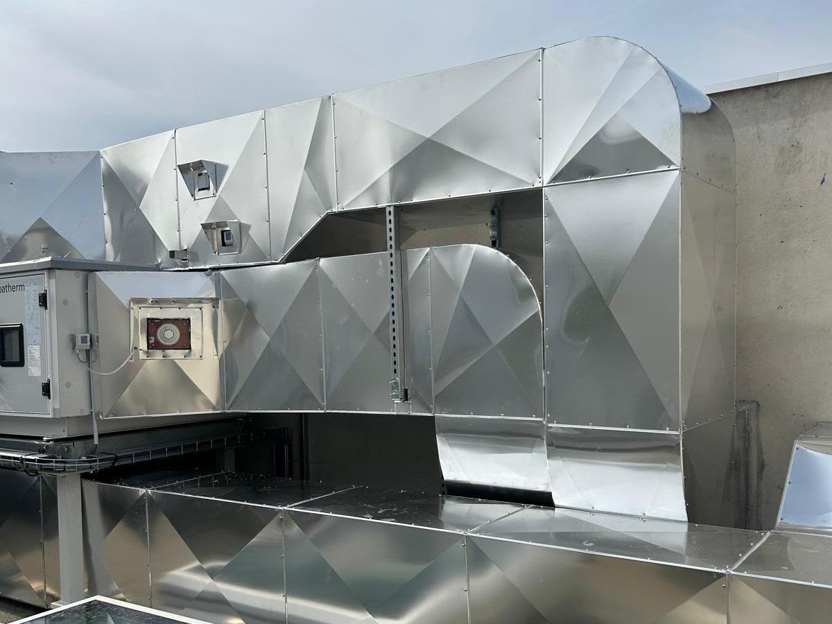 L’élément central de l’intervention est la pose d’une gaine de ventilation habillée en tôle Isoxal. Ce matériau, reconnu pour sa résistance à la corrosion et aux intempéries, est particulièrement adapté aux installations extérieures exposées. La gaine permet d’assurer une circulation d’air régulière et contrôlée, optimisant ainsi le renouvellement de l’air dans les zones desservies. Le choix de l’Isoxal garantit également une meilleure longévité de l’installation et réduit la fréquence des opérations de maintenance.