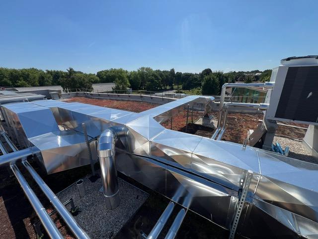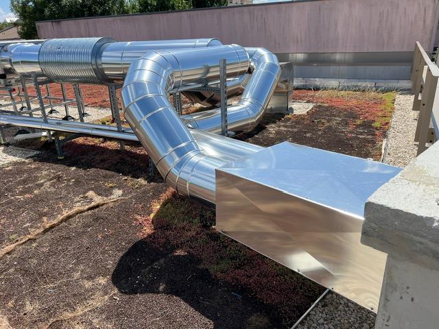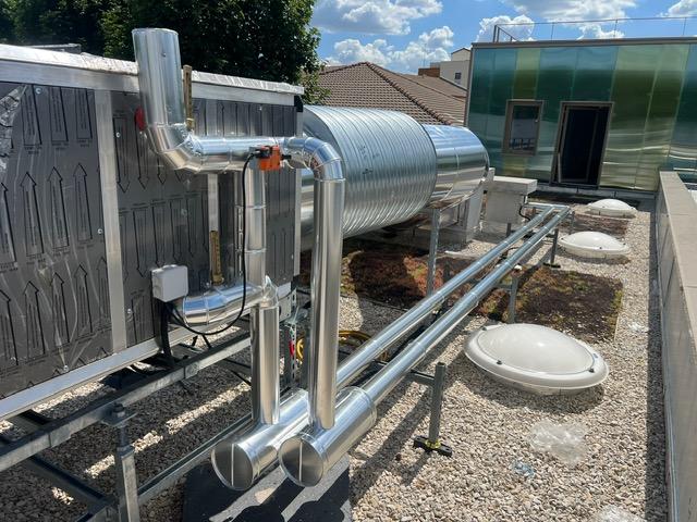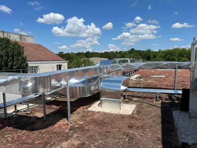 Le projet s’est concentré sur l’aménagement d’une terrasse de gaine ventilation, servant de support aux installations de chauffage posées par ERCE. Ce type d’espace, souvent invisible du grand public, joue pourtant un rôle central dans la performance énergétique du bâtiment. Il accueille les réseaux de tuyauteries assurant la circulation de chaleur dans l’ensemble de la structure.
